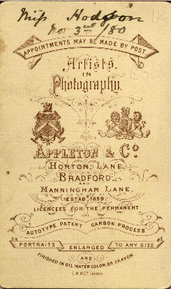 Appleton & Co.. Horton Lane, Bradford and Manningham Lane. Estab. 1859.(Miss Hodgson, Nov.3rd /80) - f8