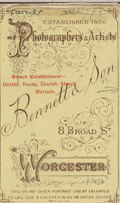 Bennett & Son, 8 Broad St. Worcester. (branch: Malvern added in red) Established 1856. No.23479,b [Farmer Family] - m8