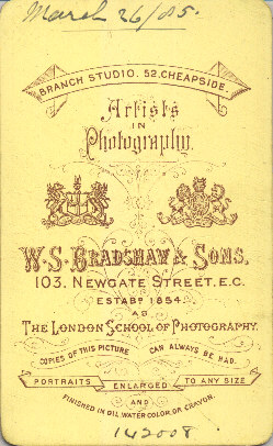 W.S.Bradshaw & Sons, 103 Newgate Street E.C. [London] Branch. 52 Cheapside. Estab 1854. (March 26 / 85) No. 142008 - m8